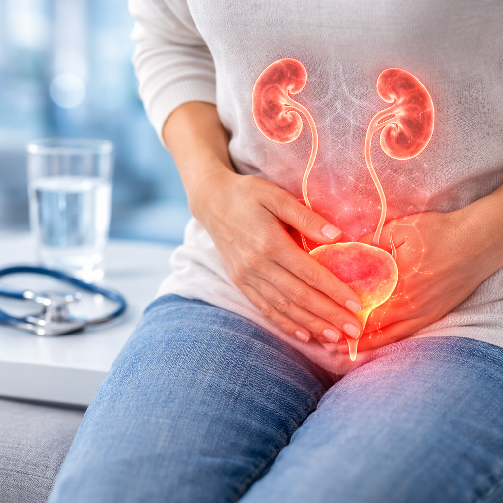A UTI occurs when bacteria enter the urethra and multiply in the urinary tract, causing symptoms such as a burning sensation during urination, frequent or urgent need to urinate, cloudy or strong-smelling urine, pelvic discomfort, and in more advanced cases, fever, chills, or back pain — which may indicate the infection has reached the kidneys (pyelonephritis).